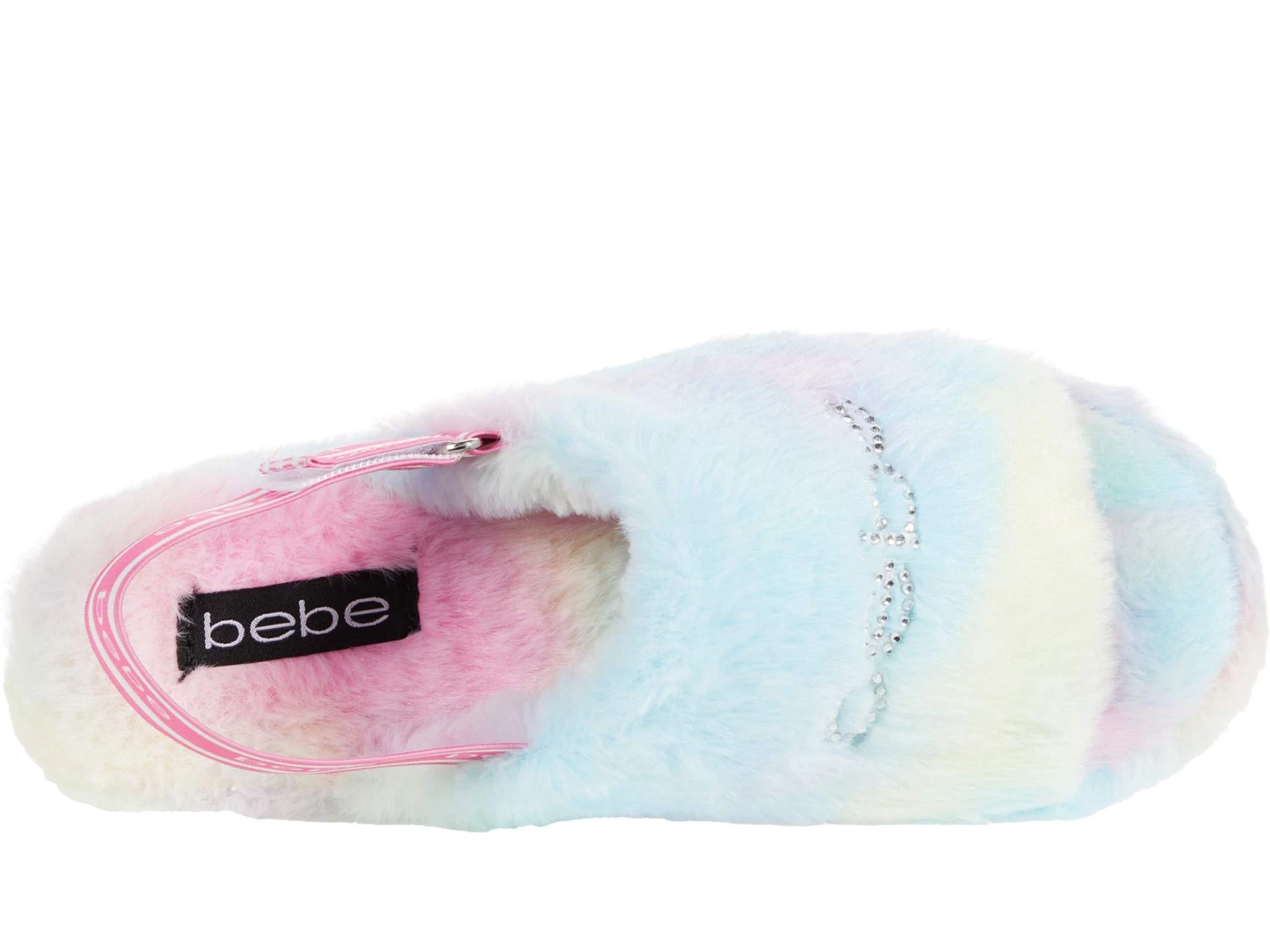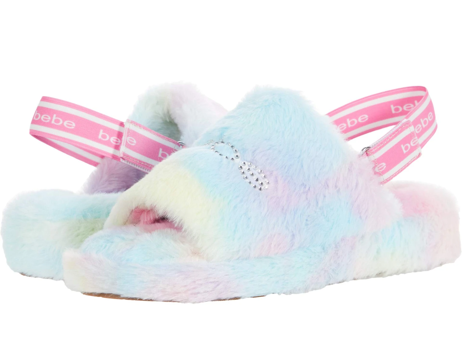 - Lounge in comfort in the Plush and comfy bebe® Jeanna. This cozy slipper features a warm faux fur upper with adjustable side strap and rhinestone bebe® logo across vamp.