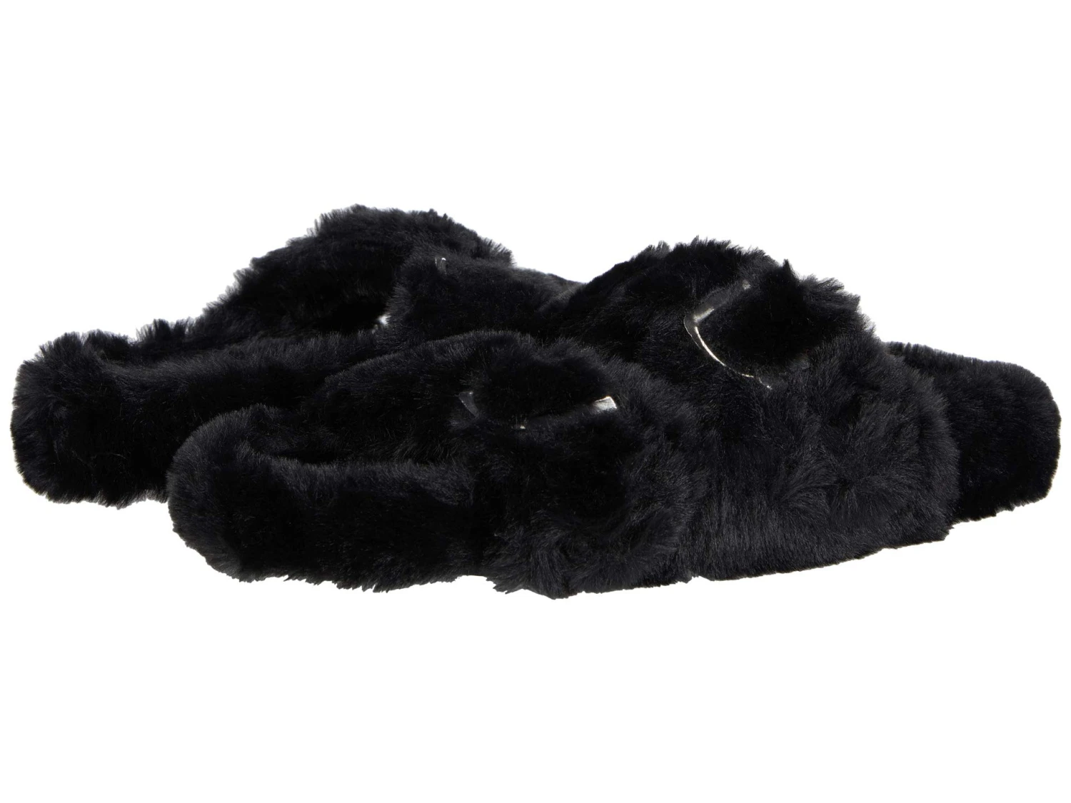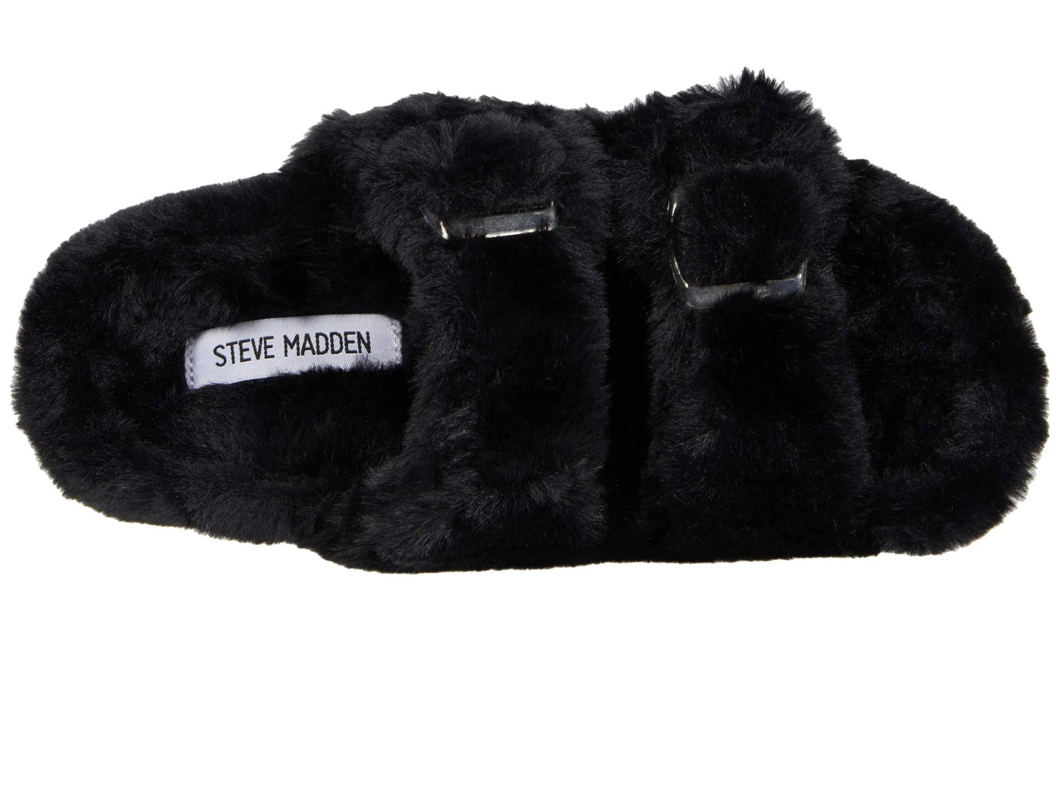- The Steve Madden® Around Slipper will keep you cozy with a plush faux-fur upper, open toe, dual buckled straps over the vamp, and an easy slip-on construction.